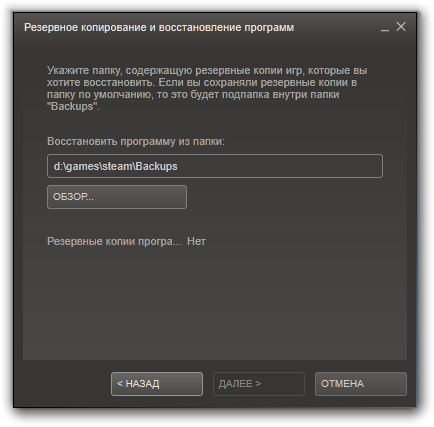 Теперь нажимаем кнопку "Обзор..." и указываем папку с резервной копией нашей игры, ту папку, внутри которой есть папки с именами "Disk_1", "Disk_2" и так далее. Если папка выбрана правильно, то в окне появится название зарезервированной игры: